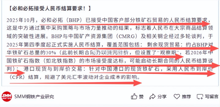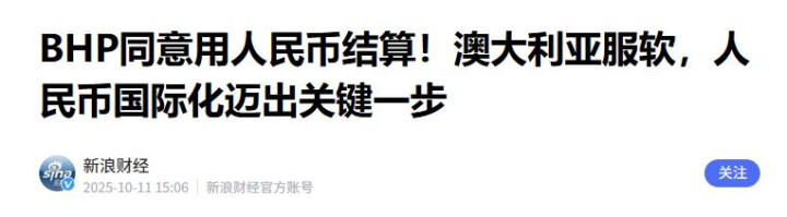 2025年10月,有消息显示中国直接用人民币,大宗采购澳大利亚矿产,还不是点对点的小单,而是通过中国矿产资源集团与BHP必和必拓集团,达成的人民币计价结算的长期铁矿交易协议。